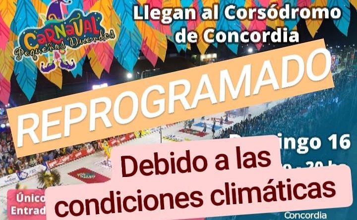 La Coordinación de Talleres Barriales y Eventos Culturales de la Municipalidad de Concordia informó que debido a las condiciones climáticas adversas y los pronósticos de lluvia, se reprogramó el desfile previsto para este domingo del Carnaval de Los Pequeños Duendes en el Corsódromo, a los efectos de preservar la integridad de los chicos participantes de las comparsas y del público asistente.
