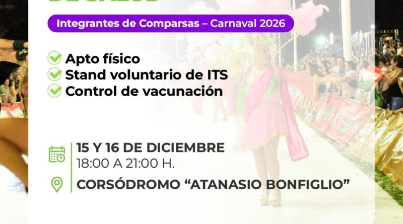 Durante los días 15 y 16 de diciembre, de 18 a 21 horas, se desarrollará una Jornada Integral de Salud en el Corsódromo, destinada a los integrantes de las comparsas de cara a la edición 2026 del Carnaval.