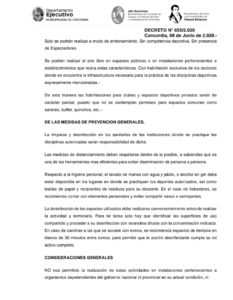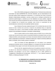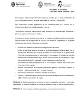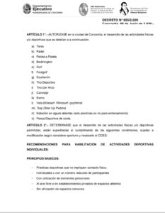 Esta tarde, el Intendente Alfredo Francolini promulgó el *Decreto Municipal N° 655*/200, *autorizando en la ciudad de Concordia la realización de determinadas actividades físicas y deportivas*, en el marco de los protocolos de prevención correspondientes.