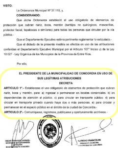 La Secretaría de Coordinación de Gestión de la Municipalidad de Concordia recuerda a la comunidad que – entre otras disposiciones que se fueron generando desde el inicio de la emergencia sanitaria por la pandemia de coronavirus Covid-19 – el Decreto Municipal 736/2020 determinó en su artículo 1° el uso obligatorio de elementos de protección que cubren nariz, boca y mentón para:
