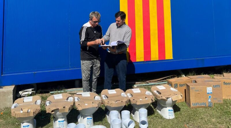 Entre los elementos entregados se incluyen inodoros con sus respectivas mochilas, caños cloacales y un tanque de agua, destinados a avanzar en la finalización de obras vinculadas a la construcción del nuevo vestuario para árbitros y los sanitarios para el público visitante.