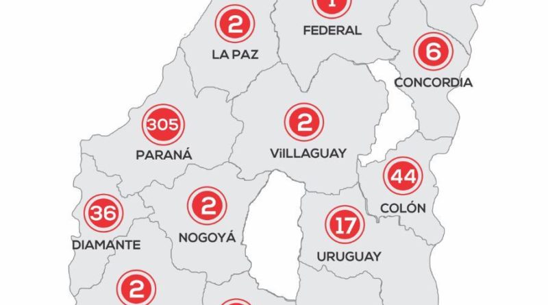 Otros 11 casos fueron detectados en Gualeguaychú, 1 paciente tiene antecedente de viaje a provincia con transmisión comunitaria (Buenos Aires) y 8 son contactos estrechos de pacientes con Covid-19. Los últimos dos sus nexos epidemiológicos se encuentran en estudio.