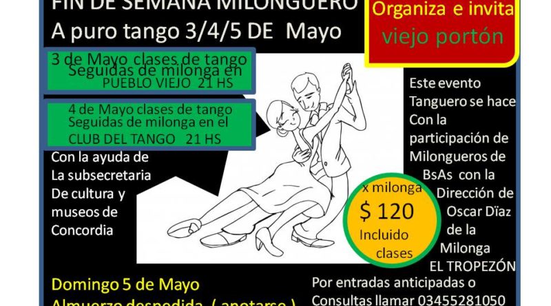 El primer fin de semana de mayo, del viernes 3 al domingo 5 de mayo se vivirá una triple jornada tanguera de la que participarán milongueros de Concordia y de la Ciudad de Buenos Aires, organizada por Viejo Portón con el apoyo de la Subsecretaría de Cultura y la Coordinación de Museos de la Municipalidad de Concordia.