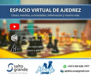 A pesar del contexto, Movete con Energía, el programa integral y deportivo de Salto Grande, continúa ampliando su oferta para los vecinos de la región. En esta oportunidad, se incorporará el Espacio Virtual de Ajedrez, que proveerá de clases en línea para el acercamiento de herramientas tácticas y estratégicas, información actual y curiosidades sobre el juego y eventos especiales. El mismo tendrá comienzo el próximo lunes de 19 a 21 horas por Youtube y en principio, se llevará a cabo hasta el mes de diciembre.