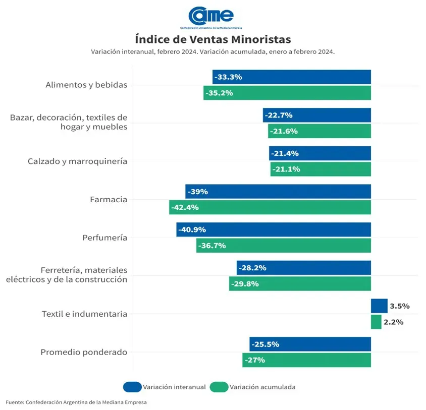 Las ventas minoristas pymes se retrajeron 25,5% en febrero, a precios constantes, y acumulan un declive del 27% en el primer bimestre del año, frente al mismo periodo del año pasado. En la comparación mensual, bajaron 7,4%, según un relevamiento realizado por la Confederación Argentina de la Mediana Empresa (CAME).