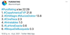 Tras finalizado el capítulo de Doctor Milagro la semifinal de la Copa América enfrentó a otra ficción turca, Fuerza de Mujer. Sin embargo, el juego de Argentina volvió a liderar seguía liderando la audiencia y con mayor ventaja, 23.0 puntos sobre 8.4 hacia las 23.19 horas.