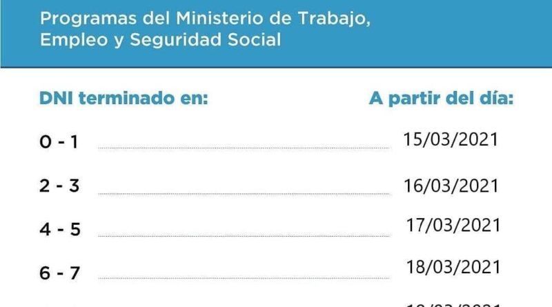 La Subsecretaría de Empleo y Economía Social de la Municipalidad de Concordia informa el cronograma de pago del mes de marzo 2021 de los siguientes programas pertenecientes al Ministerio de Trabajo, Empleo y Seguridad Social de la Nación: Jóvenes con Más y Mejor Trabajo (JMyMT), Seguro de Capacitación y Empleo (SCyE), Programa de Inserción Laboral (PIL).