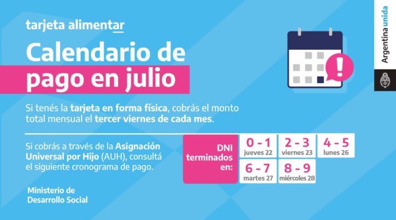 Comunicamos el cronograma de pago de la Tarjeta Alimentar para el mes de julio