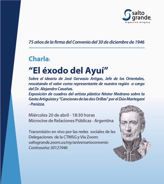 Como parte de la agenda de eventos conmemorativos por los 75 años de la Firma del Convenio de 1946, Salto Grande presenta “El éxodo Ayuí”, una charla abierta al público, a cargo del Dr. Alejandro Cabañas, que rescata el ideario y valor de José Gervasio Artigas como representante histórico de la región. La misma se llevará a cabo este miércoles 20 de abril a partir de las 18:30 horas.