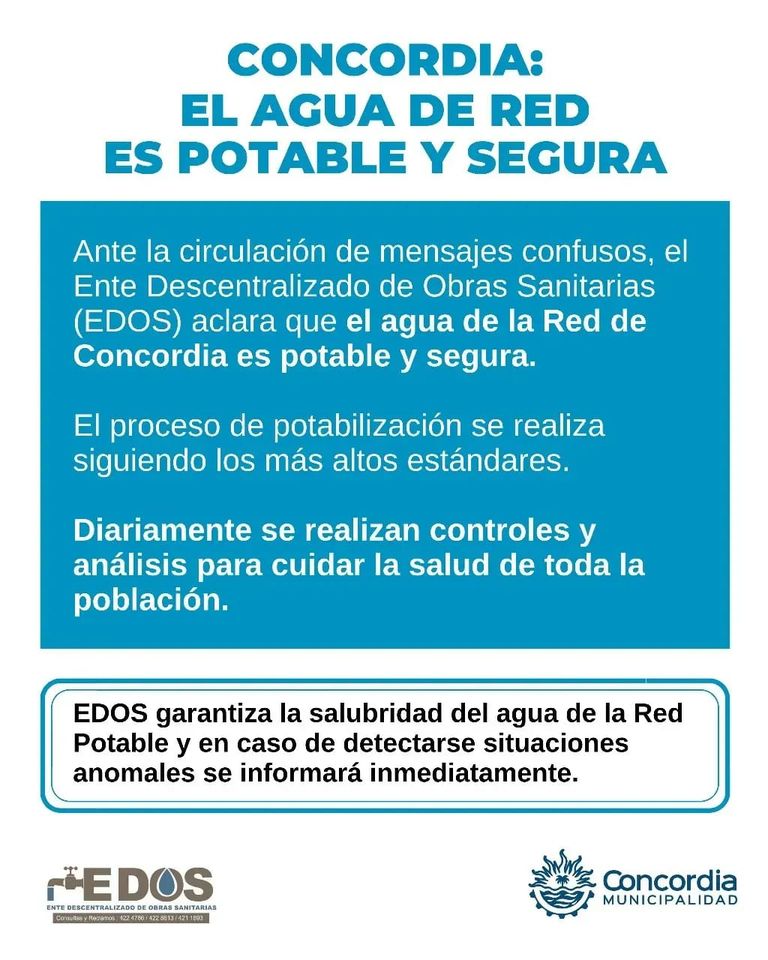 Ante la circulación de mensajes confusos, el Ente Descentralizado de Obras Sanitarias (EDOS) aclara que el agua de la Red de Concordia es potable y segura.