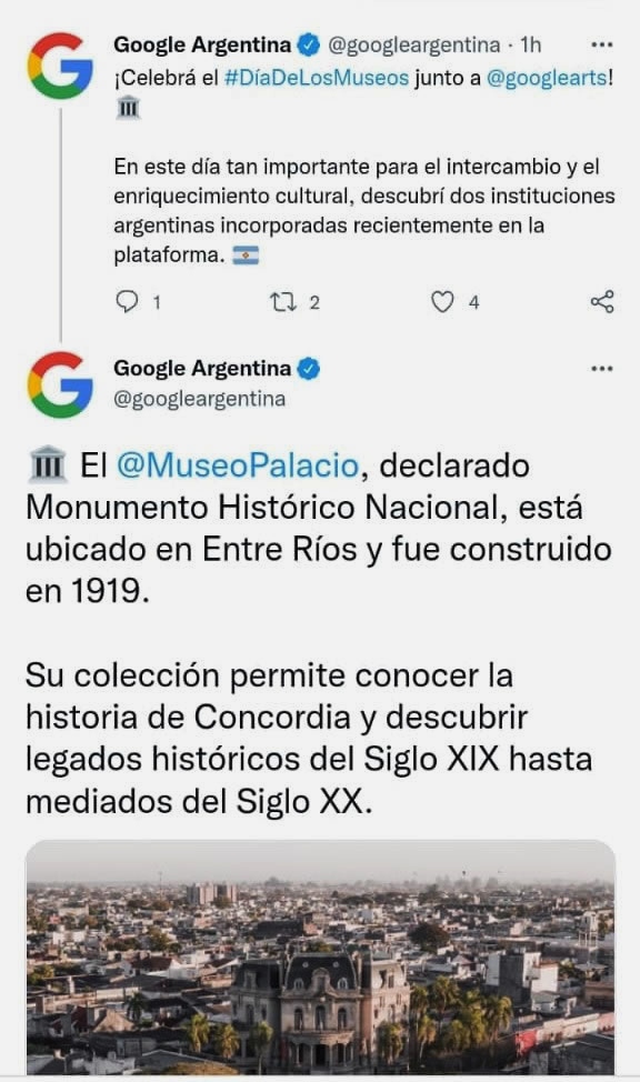 «A través de menciones especiales en la cuenta oficial de Google Argentina en Twitter, y en informes publicados en diarios nacionales y medios de todo el continente, el buscador de Internet destacó la incorporación del Museo Regional Palacio Arruabarrena a la plataforma Google Arts & Culture», señaló el intendente Alfredo Francolini.