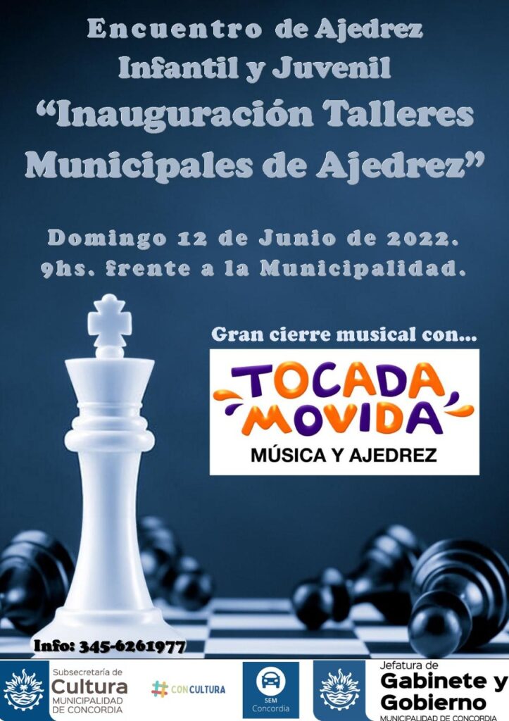 En la plaza principal de la ciudad se llevará a cabo el Encuentro Concordiense de Ajedrez Infantil y Juvenil 2022. La actividad será además la presentación formal de los Talleres Municipales de Ajedrez, que impulsa la gestión del intendente Alfredo Francolini. Y contará con la presentación de la banda musical “Tocada, Movida”, integrada por músicos que son además profesores de ajedrez, y que vienen de participar (entre otras actividades) de las jornadas Ajedrecear, organizadas por el Ministerio de Cultura de la Nación a fines del año pasado.