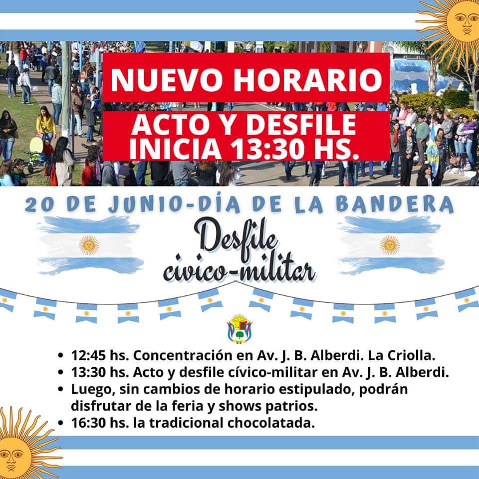 Queremos informar que el ACTO Y DESFILE (en ese orden) del 20 de junio se llevarán a cabo a las 13:30 hs. en la Av. J. B. Alberdi (Fuente del Bicentenario).