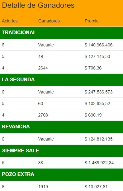 En el Tradicional salieron el 15-07-38-28-11-16. Ningún apostador acertó todos los números y el pozo quedó vacante. Acumula para el próximo sorteo $140.966.406.