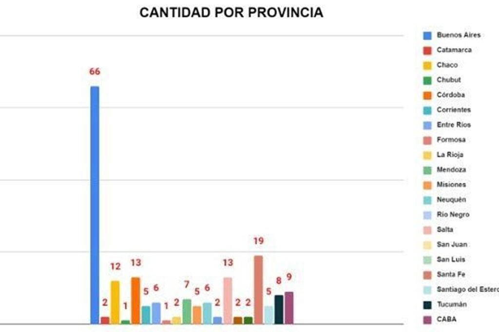 La provincia que más casos registra es Buenos Aires con 67 femicidios, seguida por Santa Fe con 19, Córdoba y Salta con 13 casos cada provincia, Chaco con 12 femicidios, Ciudad Autónoma de Buenos Aires y Tucumán con 8, Mendoza con 7 y Neuquén y Entre Ríos con 6 cada jurisdicción.