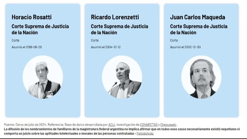 El nombramiento de familiares en los tribunales federales de Argentina despierta alertas sobre posibles casos de nepotismo. Los sitios de investigación periodística Chequeado y CONNECTAS analizaron una base de datos de empleados en 14 provincias, donde cuatro de cada 10 magistrados tienen familiares trabajando en sus Juzgados o en otras dependencias. A ellos se suman tres ministros de la Corte Suprema de la Nación.