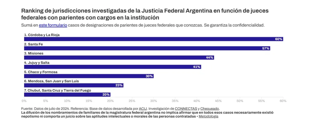 Pero no es la única. Una investigación periodística de los sitios Chequeado y CONNECTAS detectó que al menos 46 de 114 jueces federales de 14 provincias tienen familiares designados en el Poder Judicial. A esta cifra se llegó a través de un análisis de las planillas de personal de julio de 2024 publicadas por el Consejo de la Magistratura y la Corte Suprema de Justicia de la Nación.