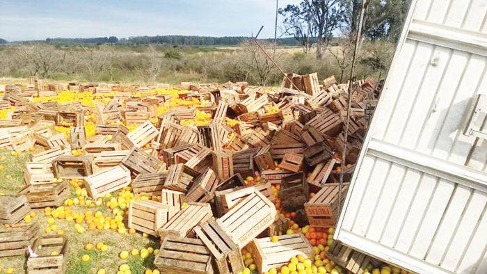 El accidente ocurrió en la mañana de este martes en el kilómetro 337 de la autovía «José Gervasio Artigas». El acoplado con las frutas, atravesaron la cinta asfáltica. Afortunadamente, no se registraron personas lesionadas.