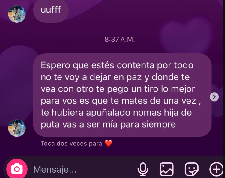 Además, la publicación en redes estuvo acompañada por fotografías en las que la joven mostró marcas de golpes en su cuerpo, además de capturas de pantalla con presuntos mensajes enviados por su ex pareja. En ellos se leen amenazas como: “No te voy a dejar en paz y donde te vea con otro te pego un tiro” y “vas a ser mía para siempre”.