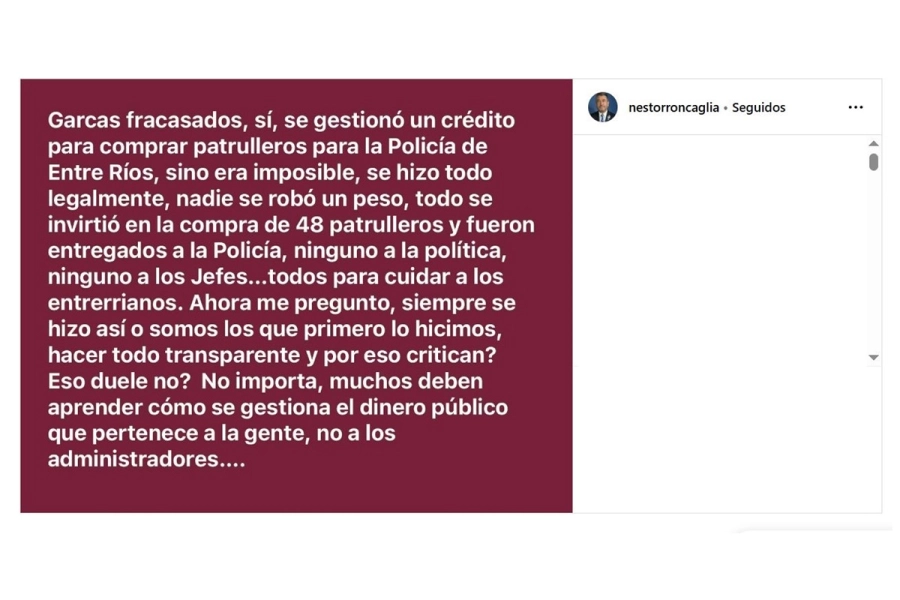 Néstor Roncaglia publicó un mensaje en la red social Instagram defendiendo la operación financiera que permitió adquirir 48 camionetas cero kilómetro, que fueron entregadas a la Policía de Entre Ríos.