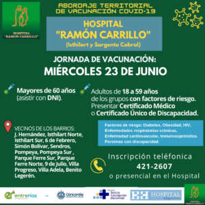 Este miércoles 23 de junio se realizará un nuevo operativo territorial descentralizado de vacunación contra el coronavirus, similar a los que ya se realizaron semanas atrás en el barrio Los Pájaros, en Carretera La Cruz y en la Clínica del Deportista. En esta oportunidad, los lugares donde se vacunará serán el hospital Ramón Carrillo, el CIC Néstor Kirchner y el centro de salud de Villa Zorraquín, alcanzando a vecinos de las zonas de influencia de estos lugares. Es requisito inscribirse previamente este martes.