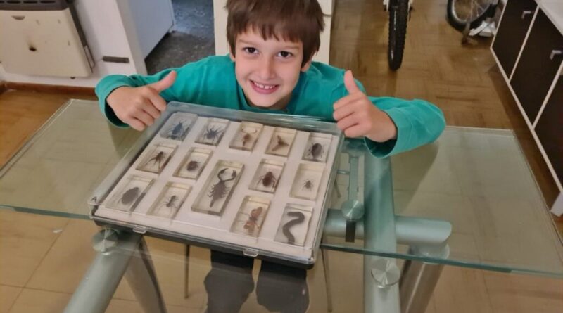 Este es Gino nuestro feliz ganador, con el premio de los bichos petrificados, una colección de 14 especies petrificadas en ámbar, otorgado por Despertar Entrerriano.