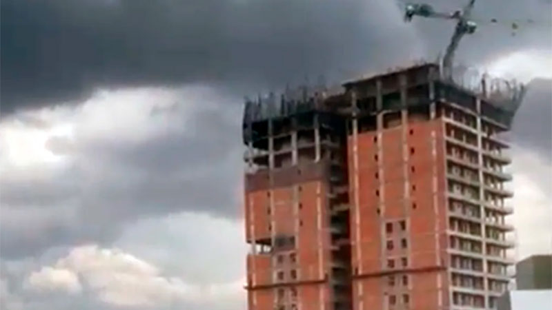 Por el temporal, una grúa cayó de un edificio en construcción