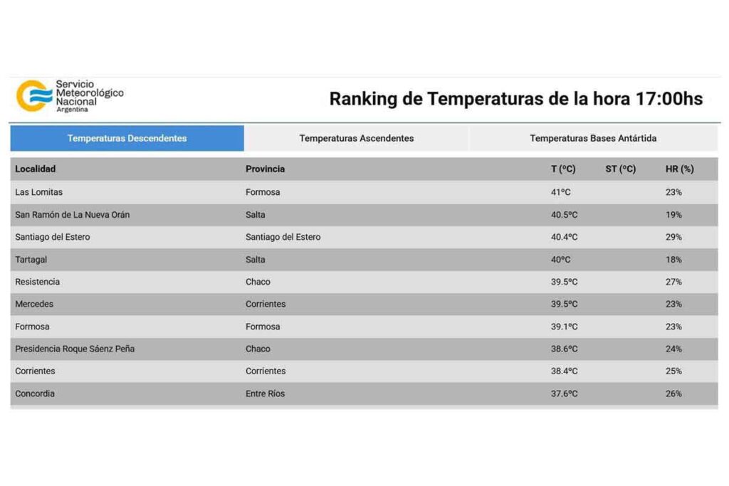 La primera de las ciudades del ranking fue la formoseña Las Lomitas, con una temperatura de 41°C. En segundo lugar se ubicó una ciudad salteña llamada San Ramón de La Nueva Orán, que registró 40.5°C.
