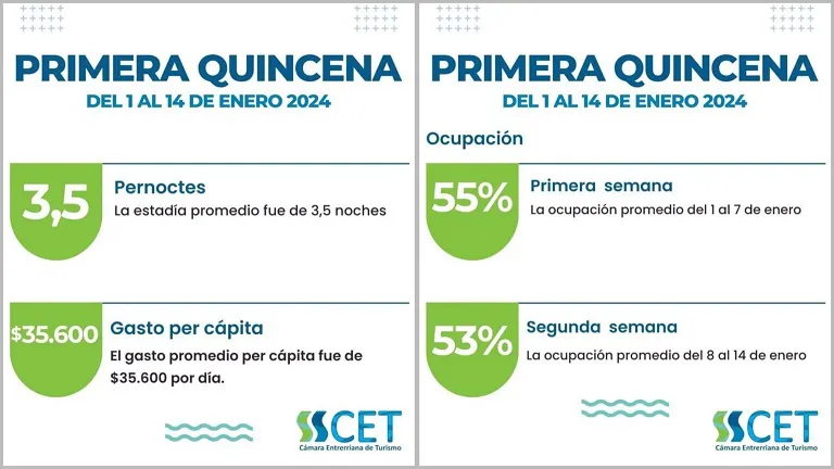 La estadía promedio de los turistas fue de 3,5 noches y el gasto promedio per cápita fue de 36.500 pesos diarios.